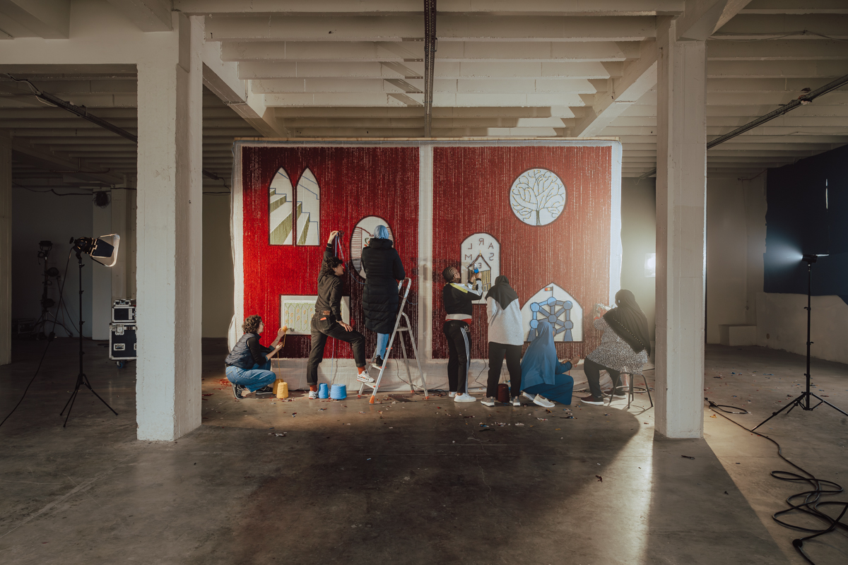 Maak & Transmettre est une collective fondée par Alice Emery, Mathilde Pecqueur et Salomé Corvalan, designeuses textiles et industriel. Depuis cinq ans, elles développent une pratique située à la croisée de l’art, du design et du champ socio-culturel. Ensemble, elles détournent la technique du tuft (technique de piquage de fils à travers un canevas pour la fabrication de tapis), qu’elles explorent au-delà du tapis pour en faire un véritable langage plastique. Leur travail s’incarne dans des pièces textiles monumentales, entre installation et scénographie, qui convoquent l’imaginaire, et sollicitent physiquement le spectateur.